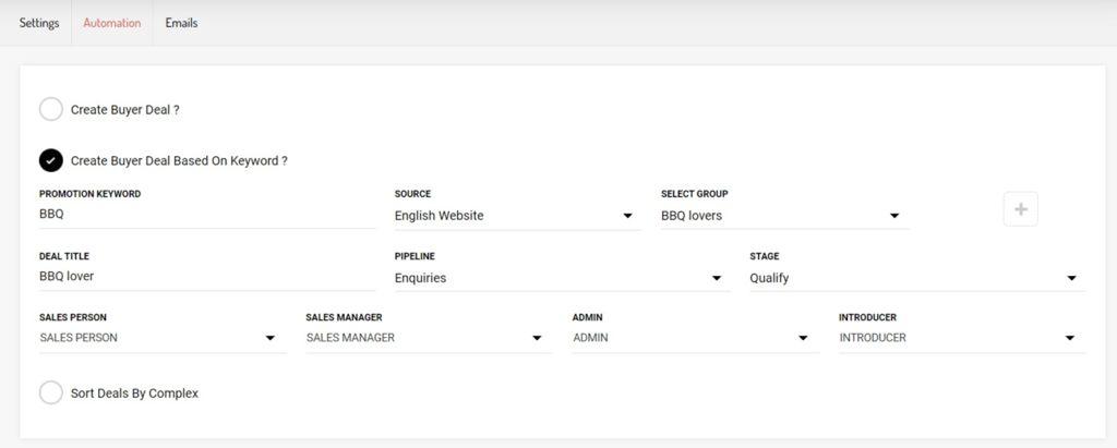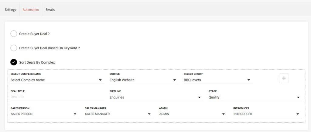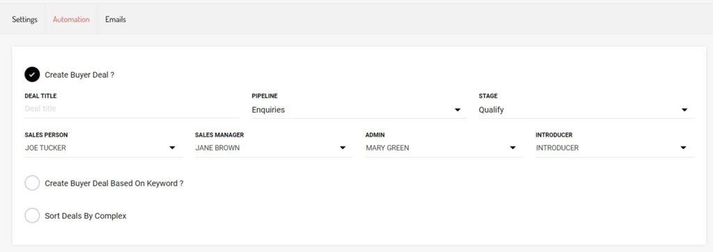 Un lector de correo electrónico puede leer cualquier campo de un correo electrónico automatizado y asignar esos datos a cualquier campo en el CRM de Respacio para crear un contacto y un acuerdo, y luego colocar ese acuerdo en una tubería de proceso.